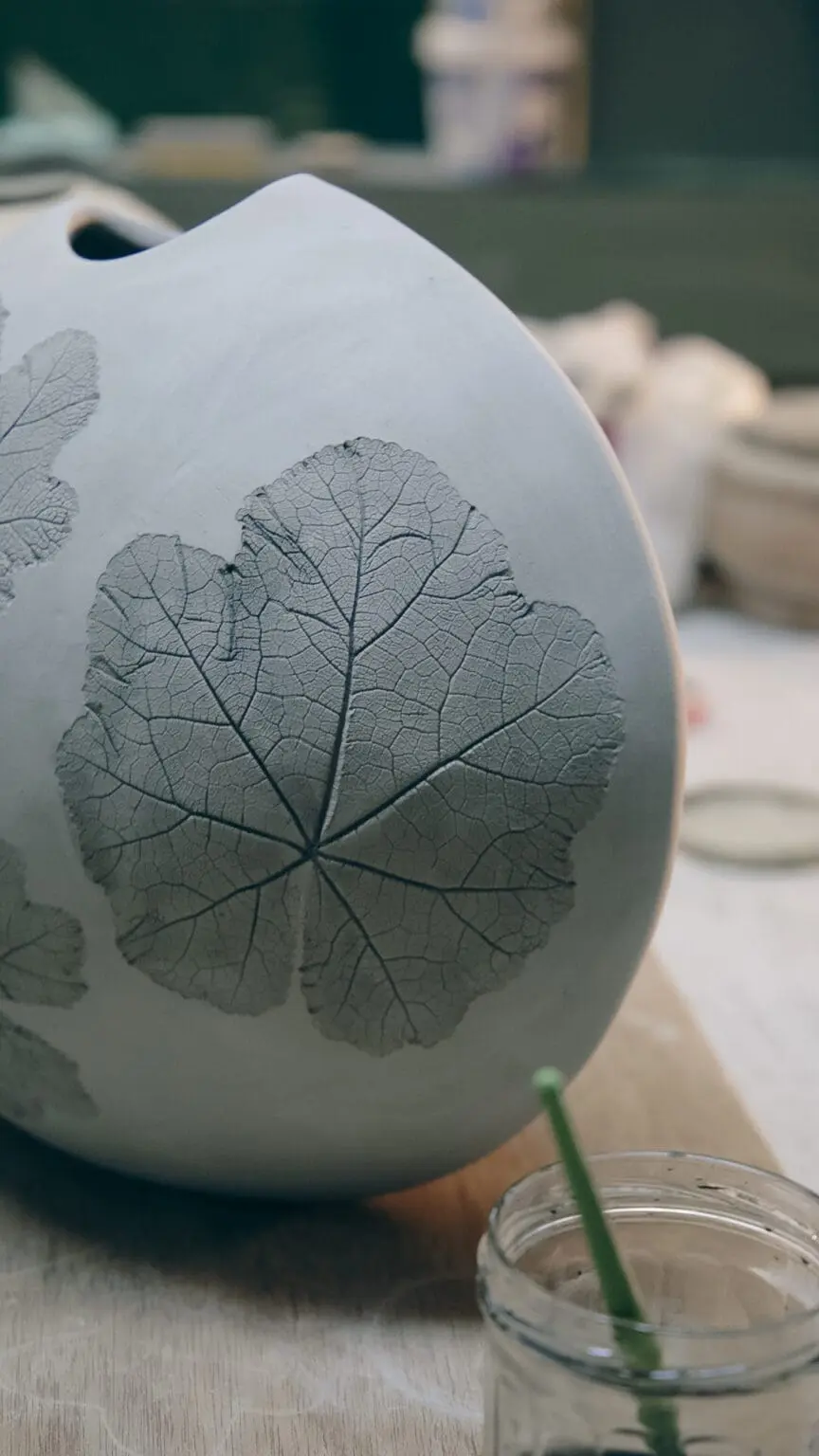 La délicatesse des plantes locales imprimée à jamais dans l’argile. Rehaussées d’oxyde bleu, ces pièces (bols, assiettes, plats) apportent poésie et lumière à votre quotidien.